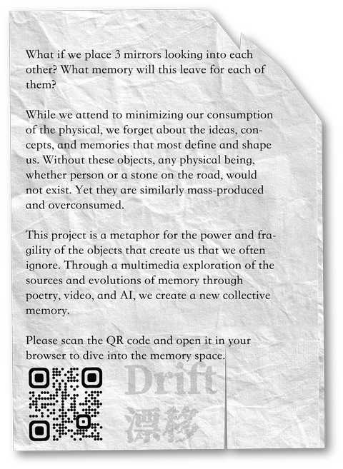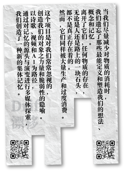 这个项目是对记忆来源和演变的探索。通过中继方法创建,我们允许我们的想法从一种媒介转移到另一种媒介。